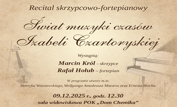 Recital skrzypcowo-fortepianowy w sali widowiskowej POK „Dom Chemika. Wydarzenie w ramach obchodów 280. rocznicy urodzin księżnej Izabeli Czartoryskiej.