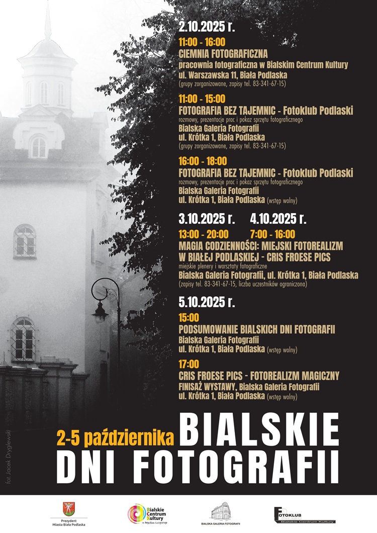 Bialskie Dni Fotografii to czterodniowe spotkanie z warsztatami, plenerami i wystawami, które pozwolą odkryć różnorodne oblicza sztuki fotograficznej. W programie znalazły się zajęcia w ciemni, plenery miejskie z Cris Froese oraz finisaż jego wystawy w Bialskiej Galerii Fotografii.