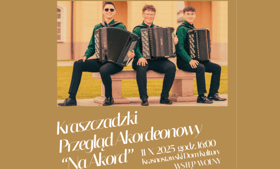 Krasnostawski Dom Kultury wypełni się akordeonowymi brzmieniami podczas Kraszczadzkiego Przeglądu Akordeonowego „Na Akord”. Solowe popisy, kameralne utwory i popularne szlagiery zaprezentują wybitni akordeoniści, a kulminacją będzie koncert nagradzanego Trio Akordeonowego ArtiS, które oczaruje publiczność energią i świeżymi interpretacjami. Po występach przewidziano wspólne muzykowanie i potańcówkę, łącząc sztukę z zabawą i integracją miłośników muzyki.