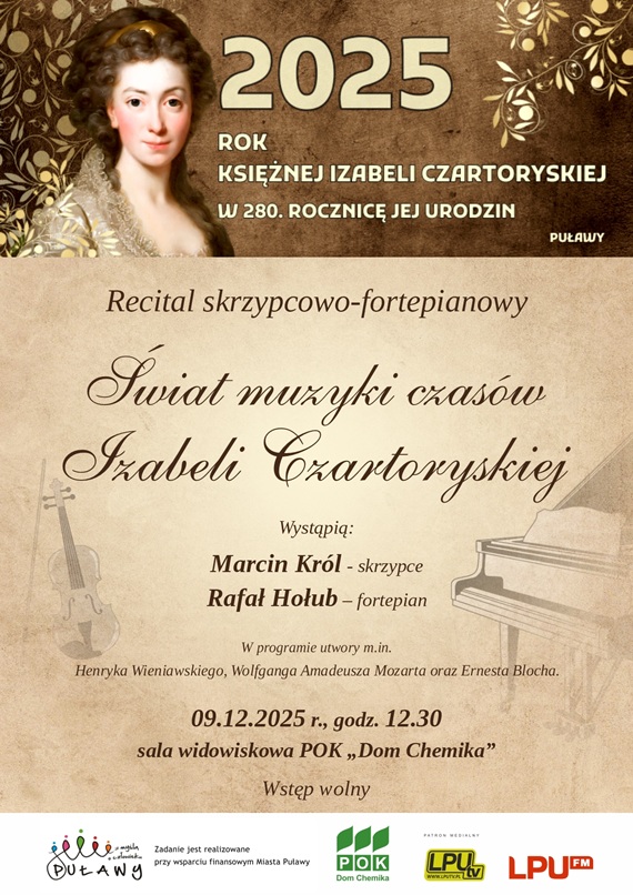 Recital skrzypcowo-fortepianowy w sali widowiskowej POK „Dom Chemika. Wydarzenie w ramach obchodów 280. rocznicy urodzin księżnej Izabeli Czartoryskiej.